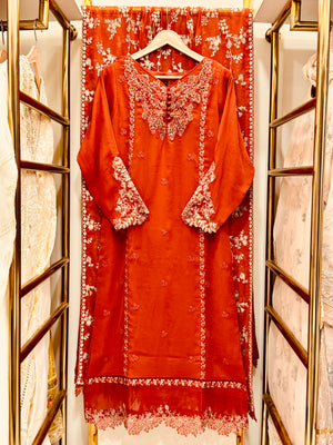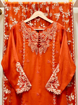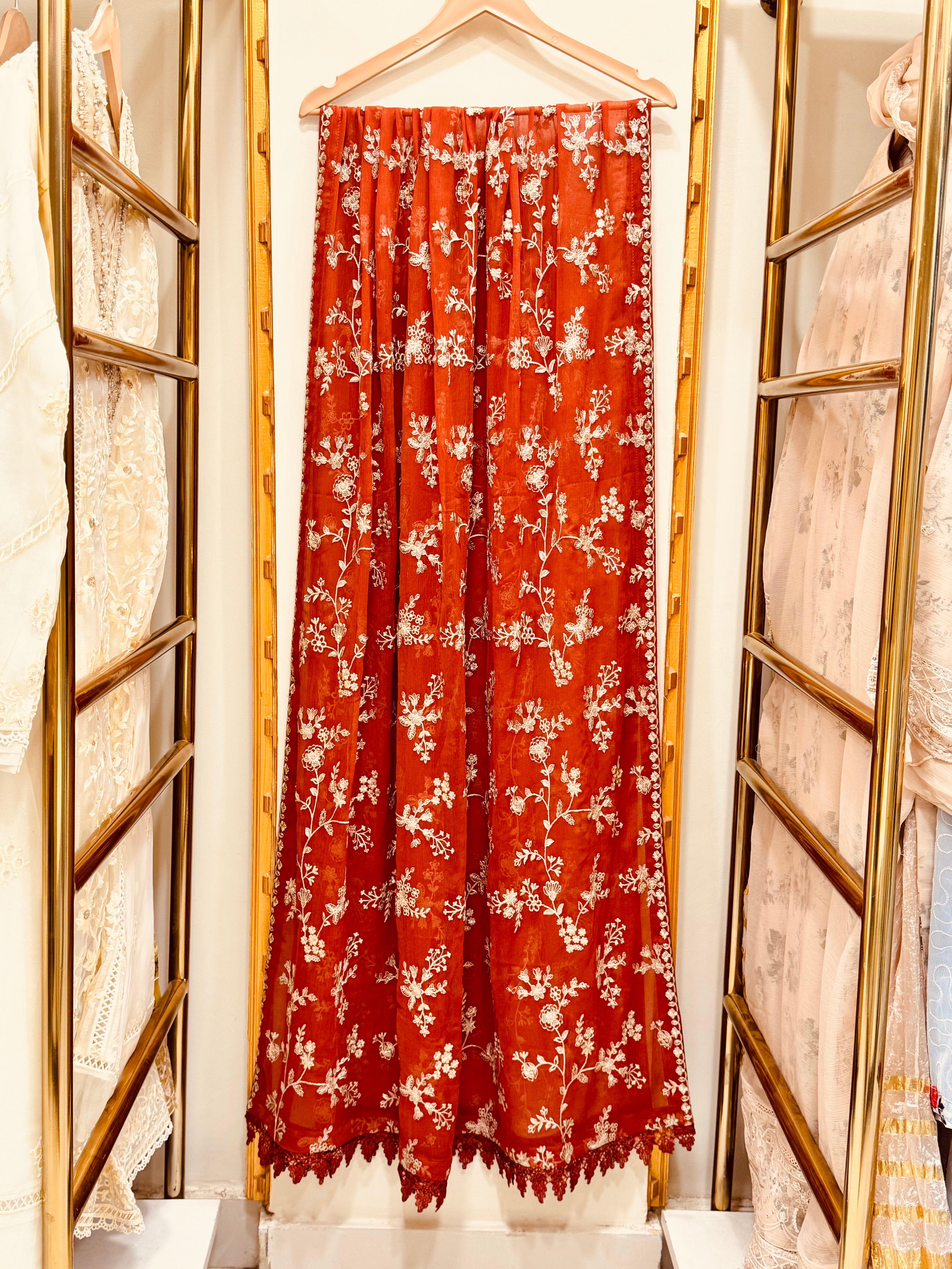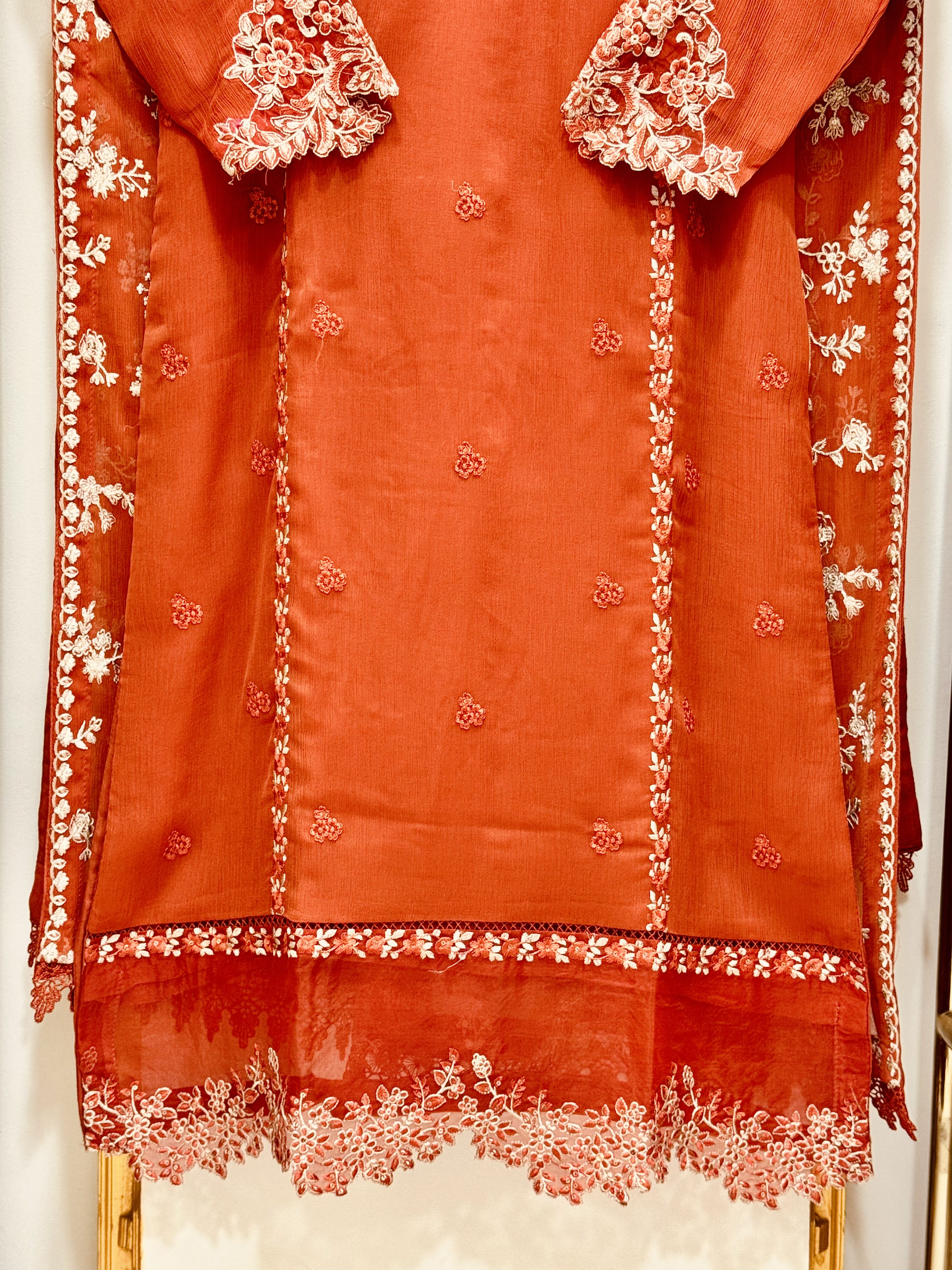 The outfit is completed with a chiffon embroidered dupatta, adorned with a pallu lace border for a polished, designer-inspired look. Lightweight and beautifully crafted, it adds the perfect finishing touch to the entire dress.