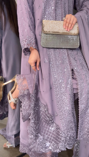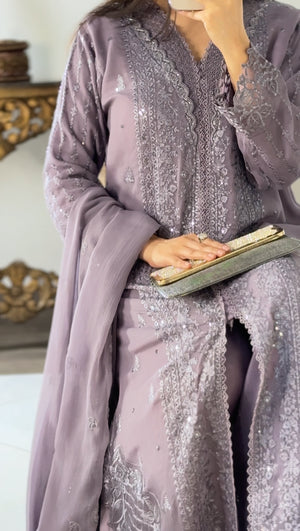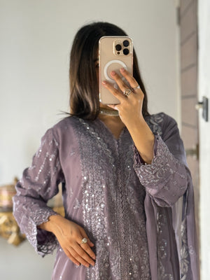 Silver Dove embodies refined elegance through a soft ash-grey palette enriched with intricate tonal embroidery. The straight-cut kurta features detailed front panels, delicately embellished sleeves, and a scalloped embroidered hem that adds subtle sophistication.