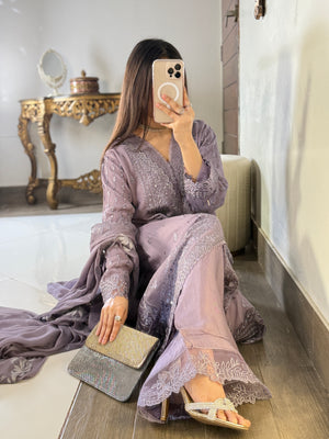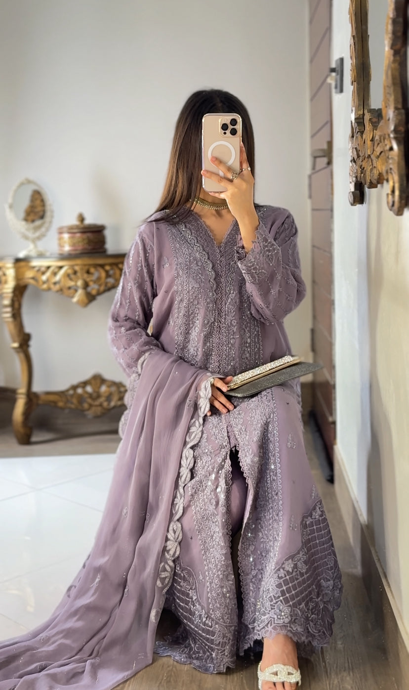 Paired with fluid wide-leg trousers and a coordinated embroidered dupatta, this ensemble is designed for graceful day-to-evening wear—perfect for women who appreciate understated luxury with impeccable finishing.