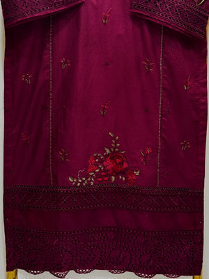 A beautifully crafted cotton embroidered 2-piece suit featuring a fully heavy thread-embroidered chikankari shirt with an organza border paired with a stylish four-piece cut cotton trouser with pintex finishing.