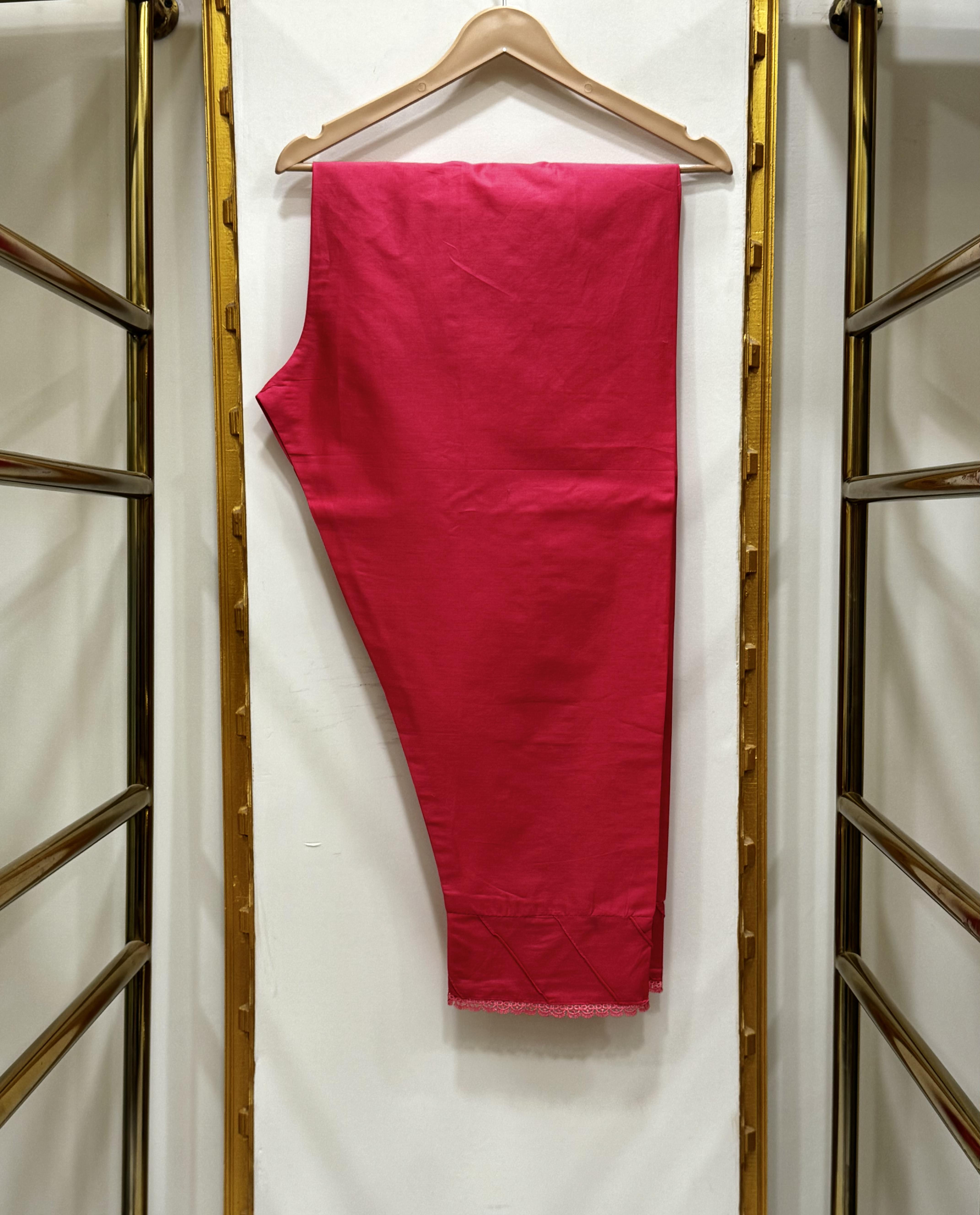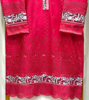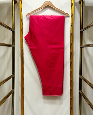 A beautifully crafted cotton embroidered 2-piece suit featuring a fully heavy thread-embroidered chikankari shirt with an organza border paired with a stylish four-piece cut cotton trouser with pintex finishing.