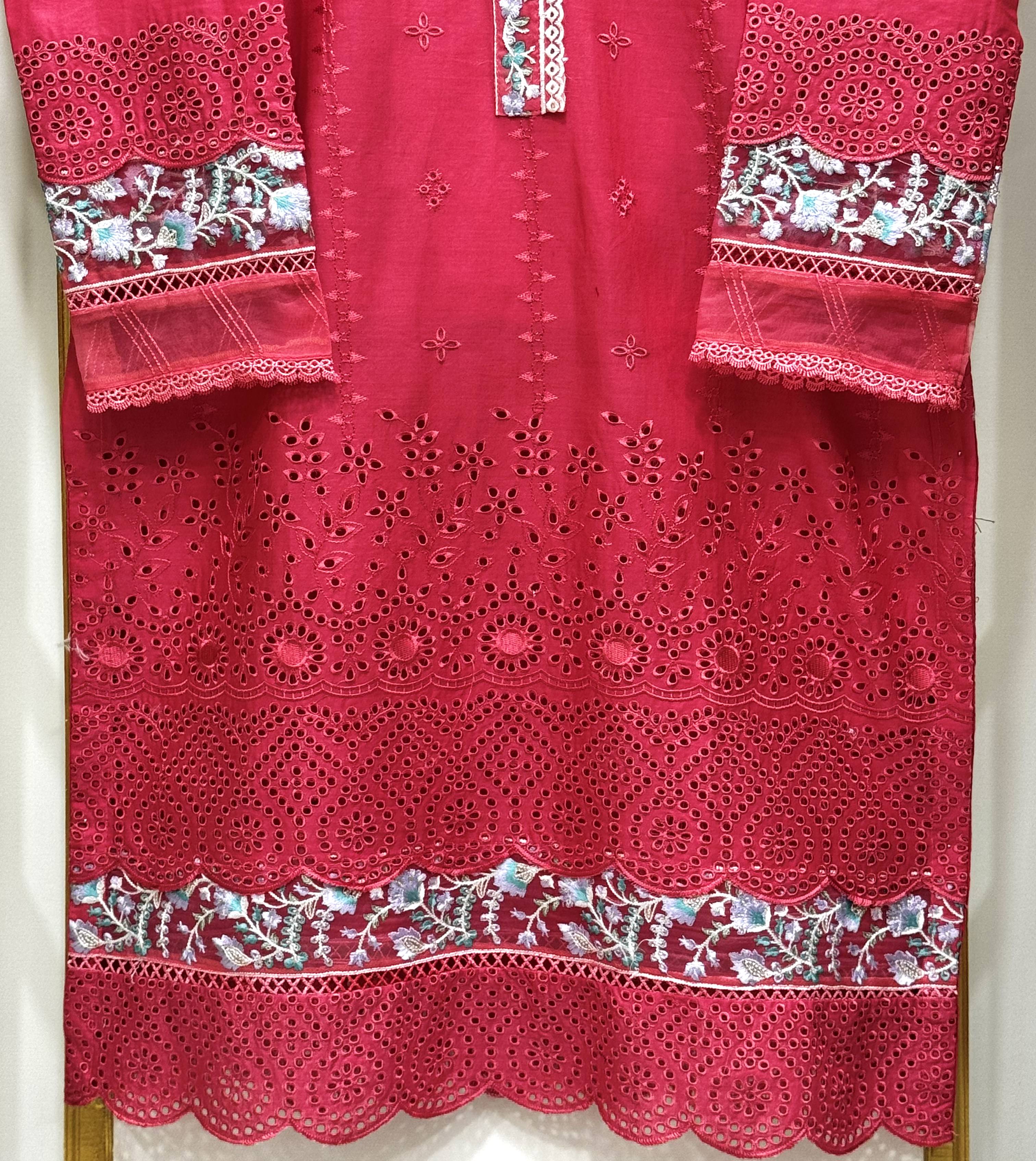 Premium cotton embroidered 2-piece Co-ord set featuring heavy chikankari work, organza border shirt, and stylish pintex trouser