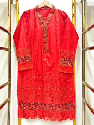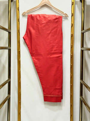 A beautifully crafted cotton embroidered 2-piece suit featuring a fully heavy thread-embroidered chikankari shirt with an organza border paired with a stylish four-piece cut cotton trouser with pintex finishing.