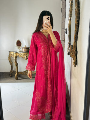 Fuchsia Flame is a bold yet elegant statement, crafted in a striking shocking pink hue that commands attention while maintaining refined balance. The kurta is elevated with intricate embroidery that enhances the vibrancy of the color without overpowering the silhouette.