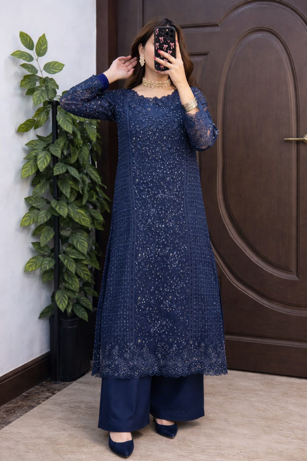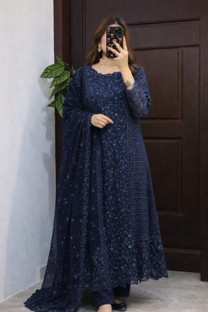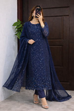 Elevate your formal wardrobe with this exquisite royal blue chiffon ensemble. The three-piece collection showcases meticulous craftsmanship with ornate sequin detailing, a gracefully embroidered dupatta, and luxurious raw silk culottes. Designed for discerning occasions—from prestigious weddings to exclusive evening affairs—this set delivers timeless elegance and refined sophistication with every wear.