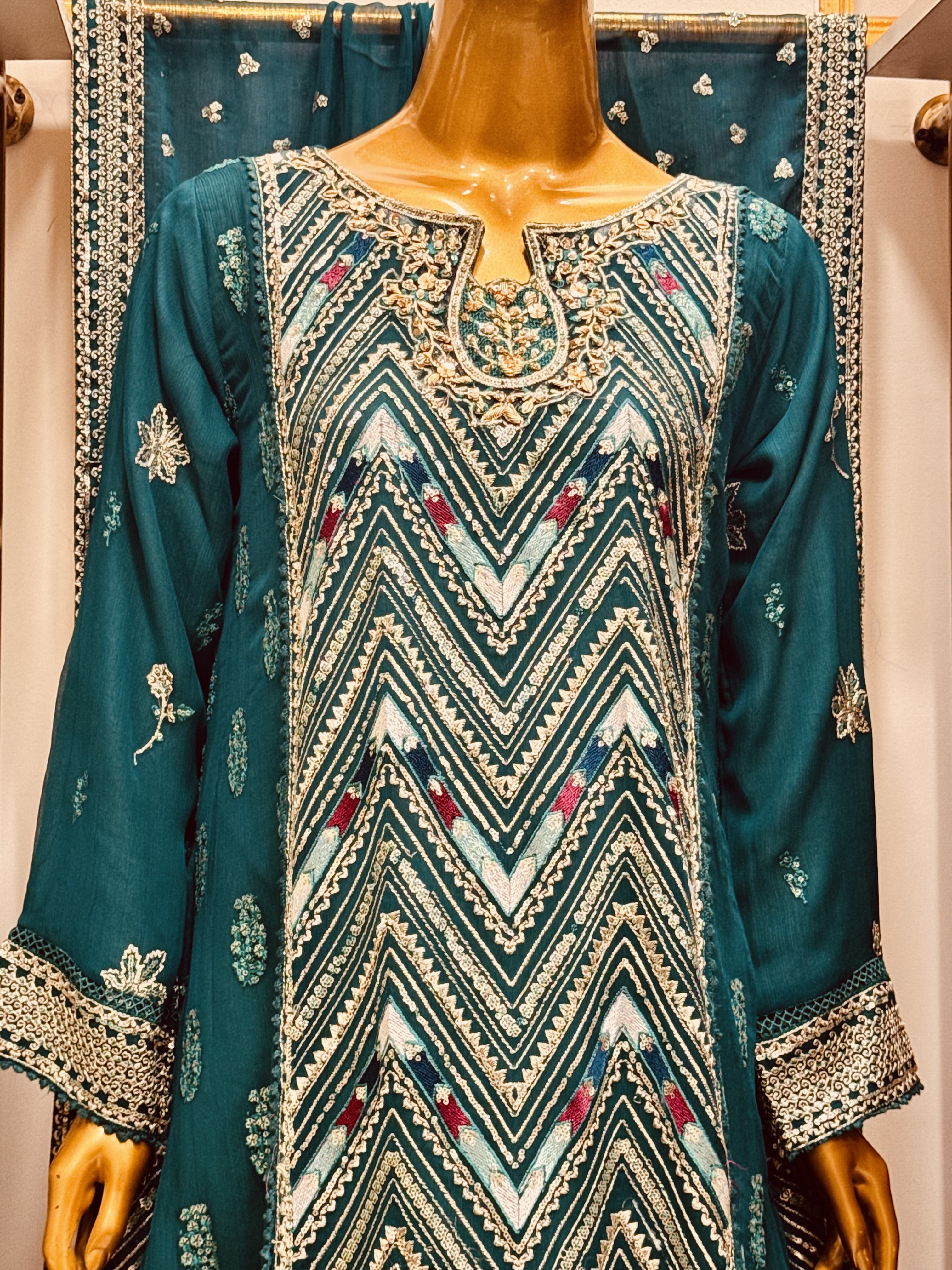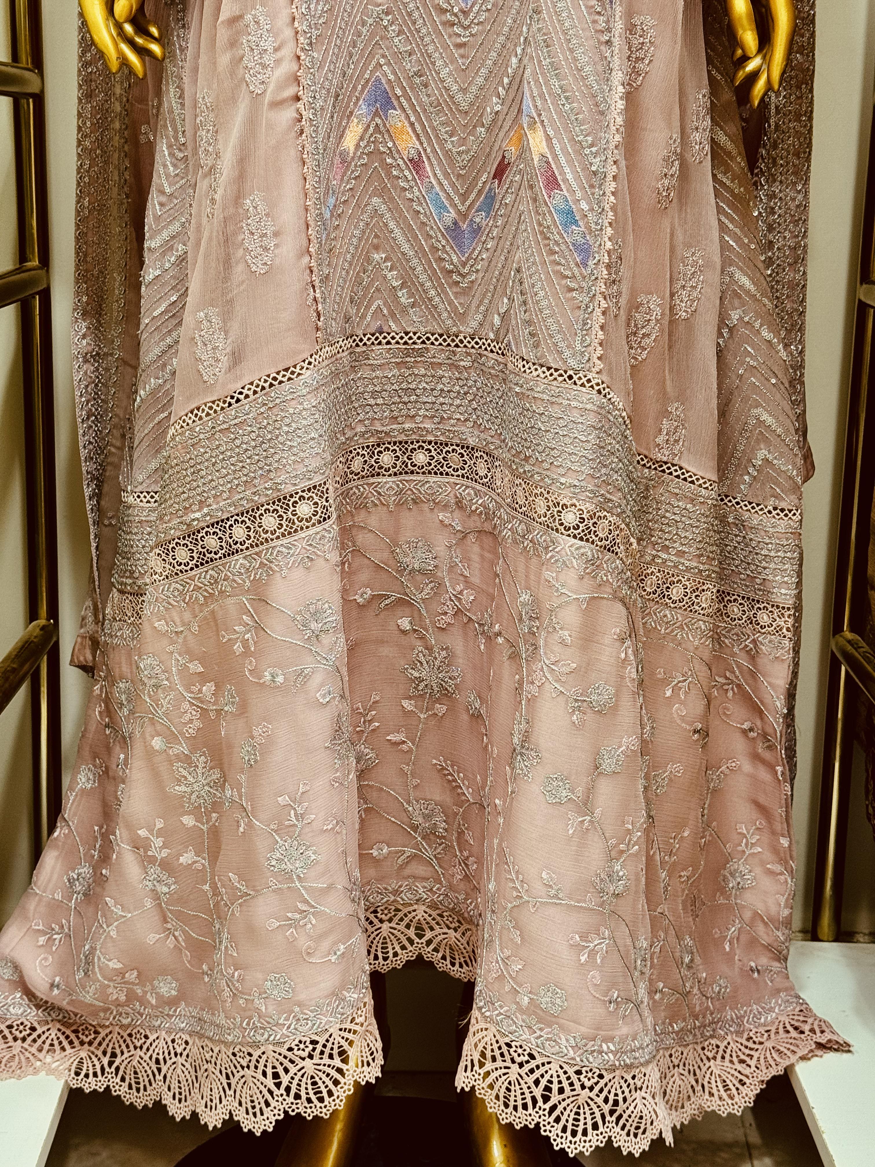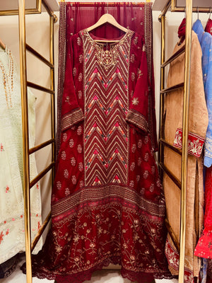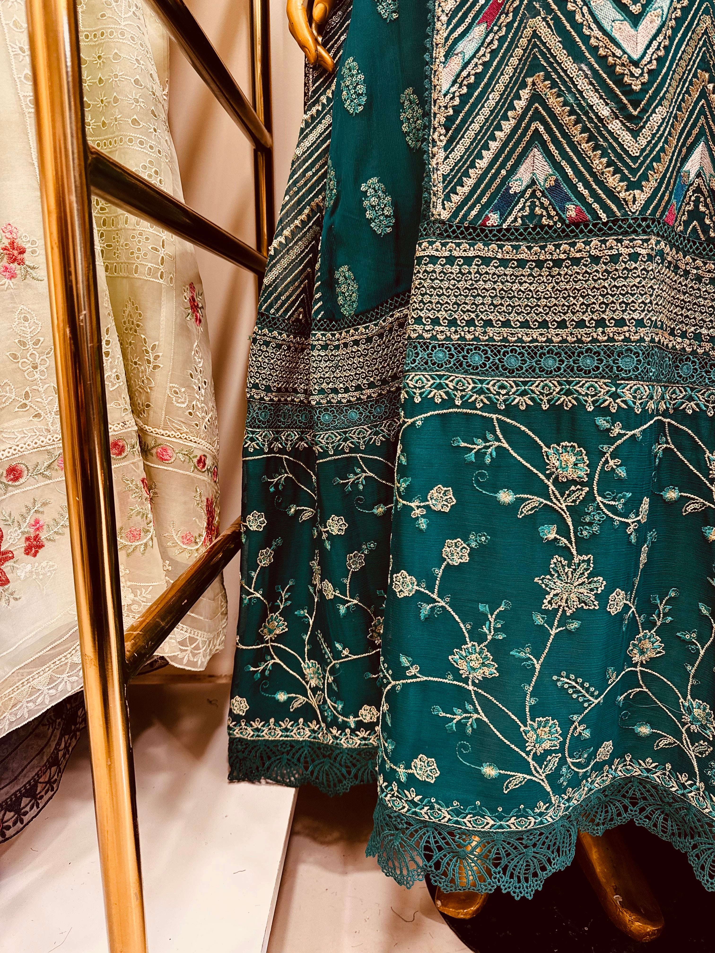Unveil elegance with our latest Chiffon Gown 3 Piece — designed with luxury embroidery, premium fabric, and timeless style. Perfect for weddings, festive wear, and formal occasions.