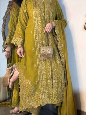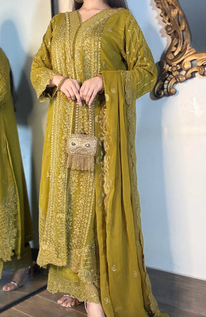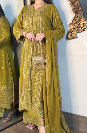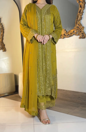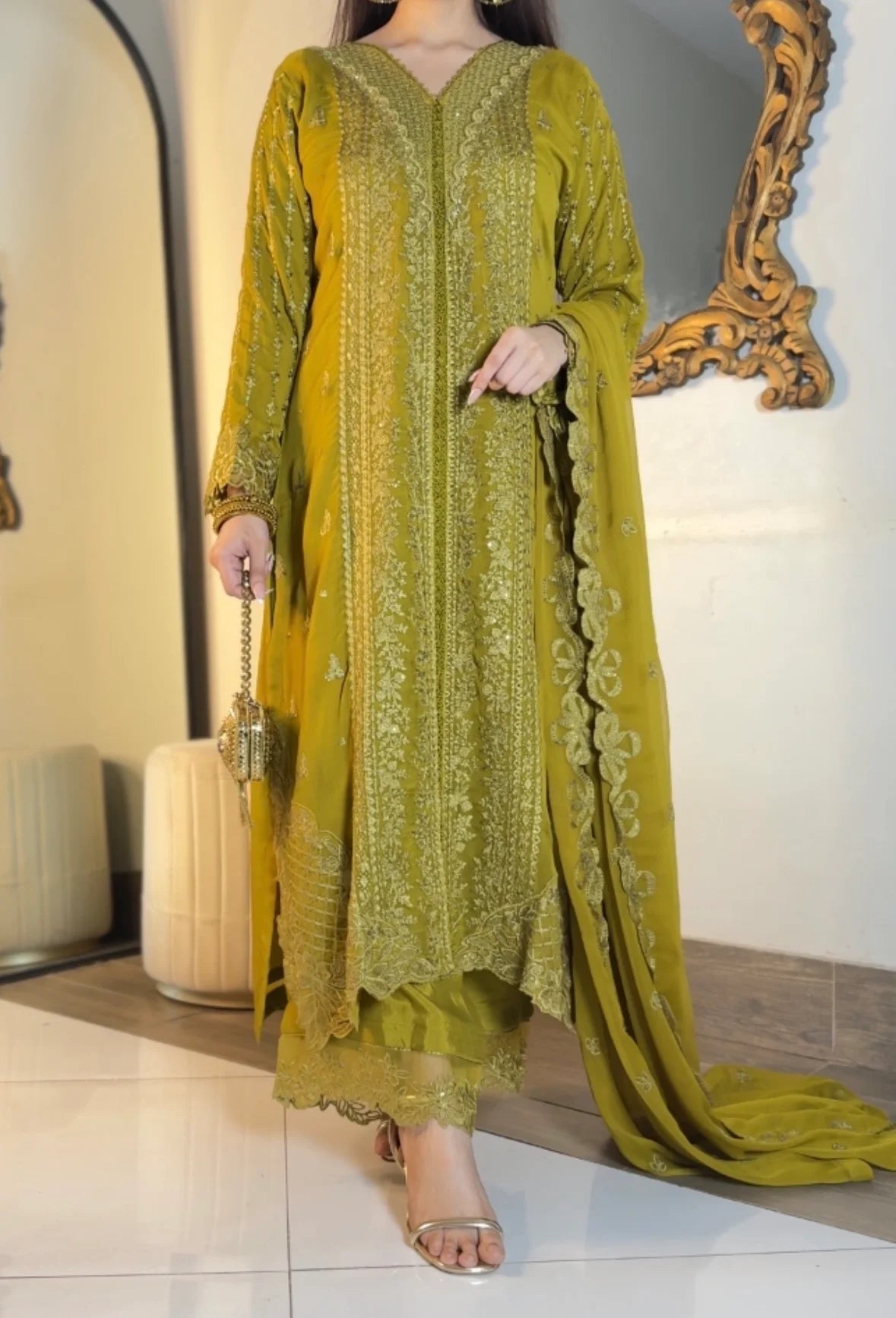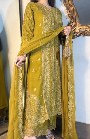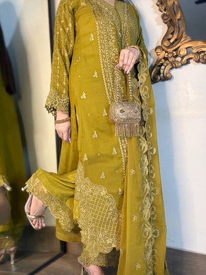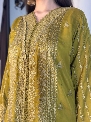 Paired with fluid wide-leg trousers and a coordinated embroidered dupatta, this ensemble is ideal for daytime elegance, festive luncheons, and refined semi-formal occasions. A timeless design that transcends seasons and trends.